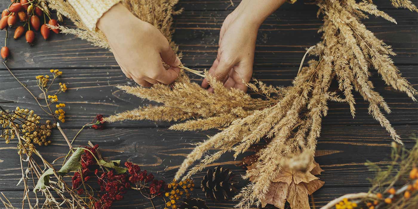 Haz una base circular con ramas flexibles (vid, sauce). Decora con hojas secas, bayas, flores preservadas, cintas rústicas o yute. Ideal para puertas o paredes.