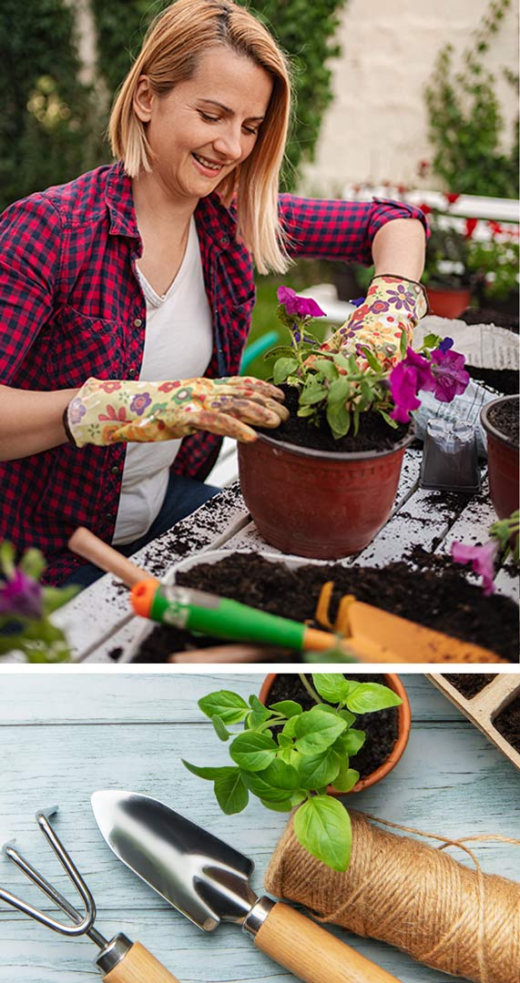 - Herramientas de mano, palas, guantes, regaderas